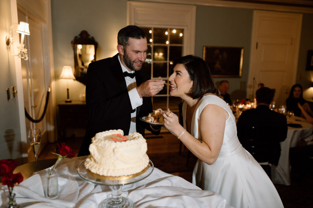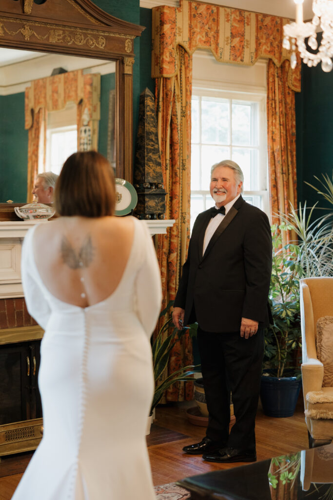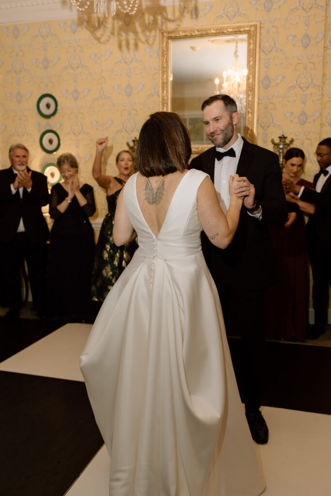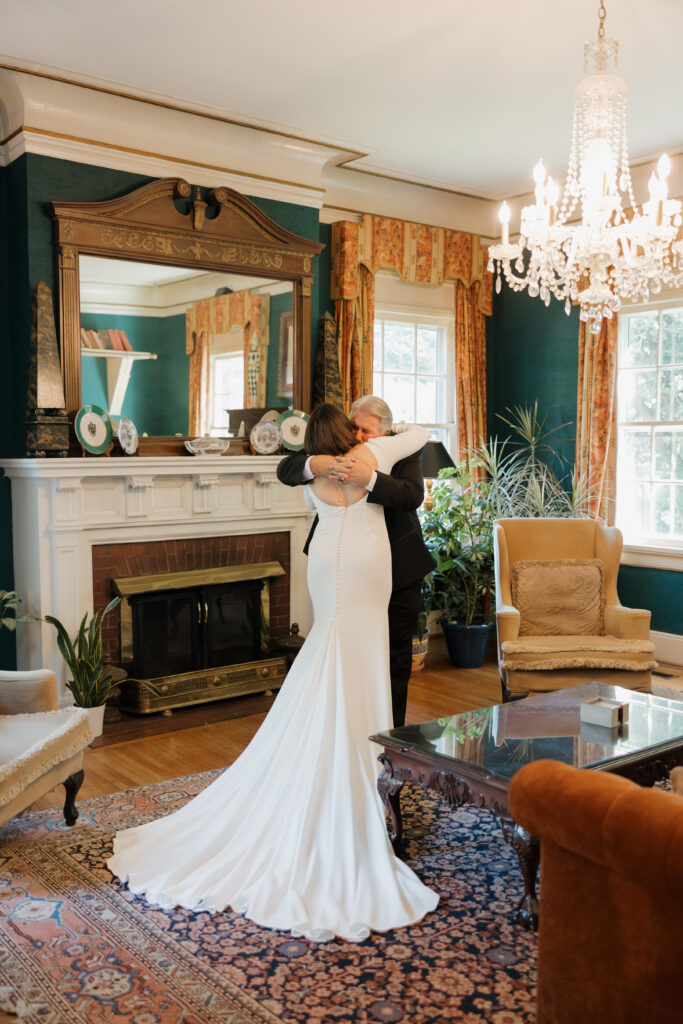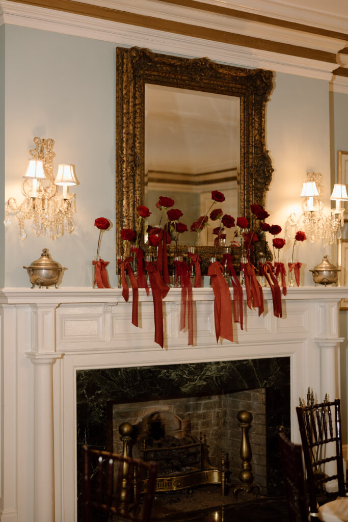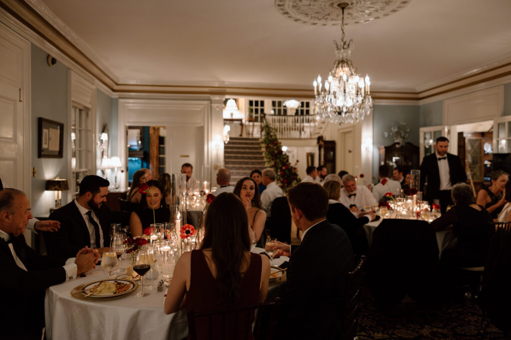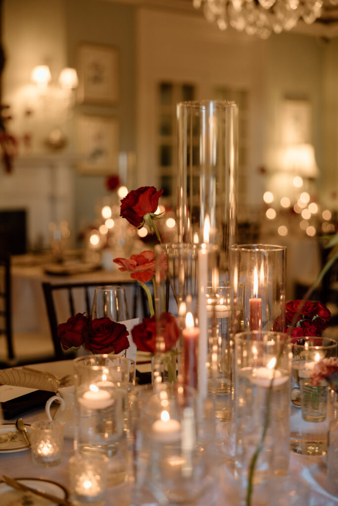 Inside the reception space, candles flickered across every surface. The mantle glowed with dozens of candles, creating a warm, intimate ambiance that wrapped everyone in light and love. Each table was dressed with elegant linens, delicate florals, and thoughtful touches that reflected Meghan and Charles’ personalities — from custom place cards to their favorite wines shared among friends. The details were stunning, the kind that make a Charlotte wedding photographer’s heart soar — everything was styled with such care and intention.