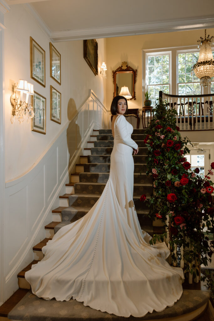 After the ceremony, guests made their way to The Moorehead Inn, where romance filled every corner. The floral installation on the grand staircase was nothing short of breathtaking: an elegant cascade of ivory and blush roses intertwined with delicate pink carnations and soft greenery. The combination of blooms created a lush, romantic texture that felt both timeless and modern — the roses adding classic elegance, while the carnations brought a touch of whimsy and sweetness. The arrangement flowed down the banister like a living piece of art, perfectly complementing the inn’s Southern architecture. Guests couldn’t resist pausing for photos beneath it, and as the afternoon light filtered through the windows, the colors seemed to glow.